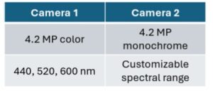 Together the two cameras provide one 4.2MP color image and one 4.2MP monochrome image. The monochrome camera can be customized with an optical filter to meet the customer’s application.